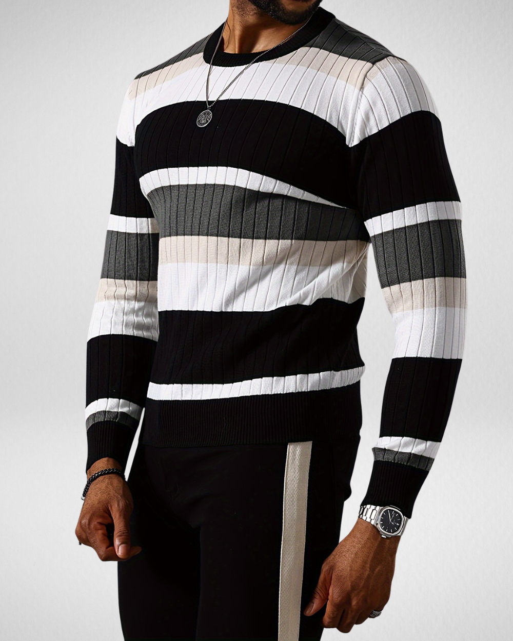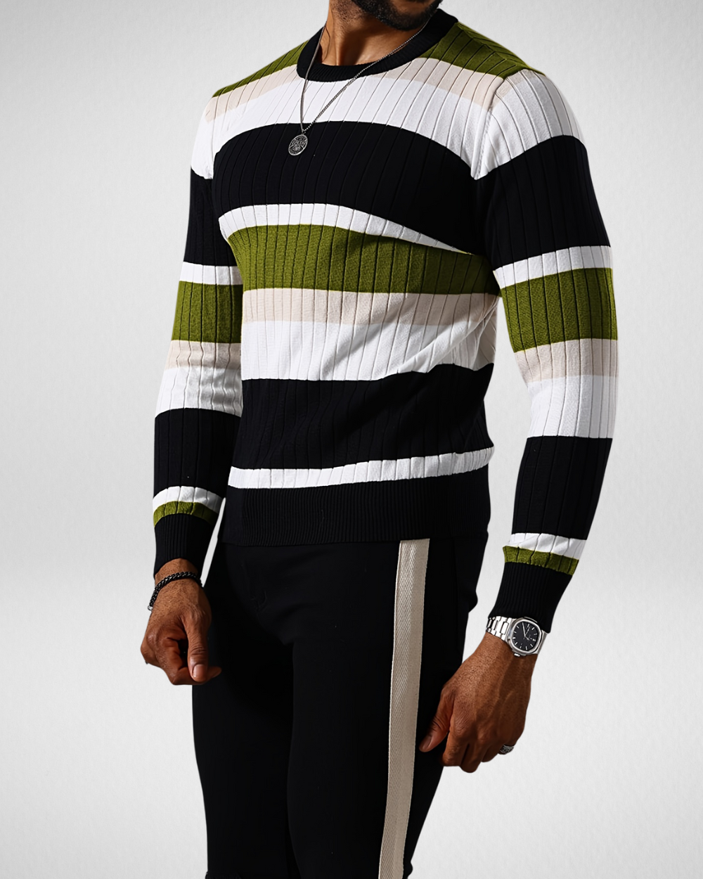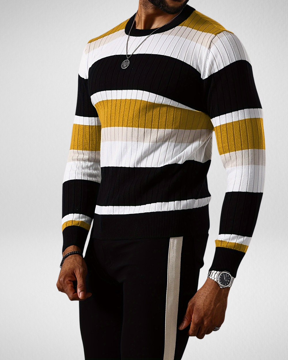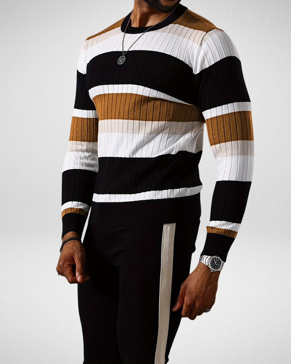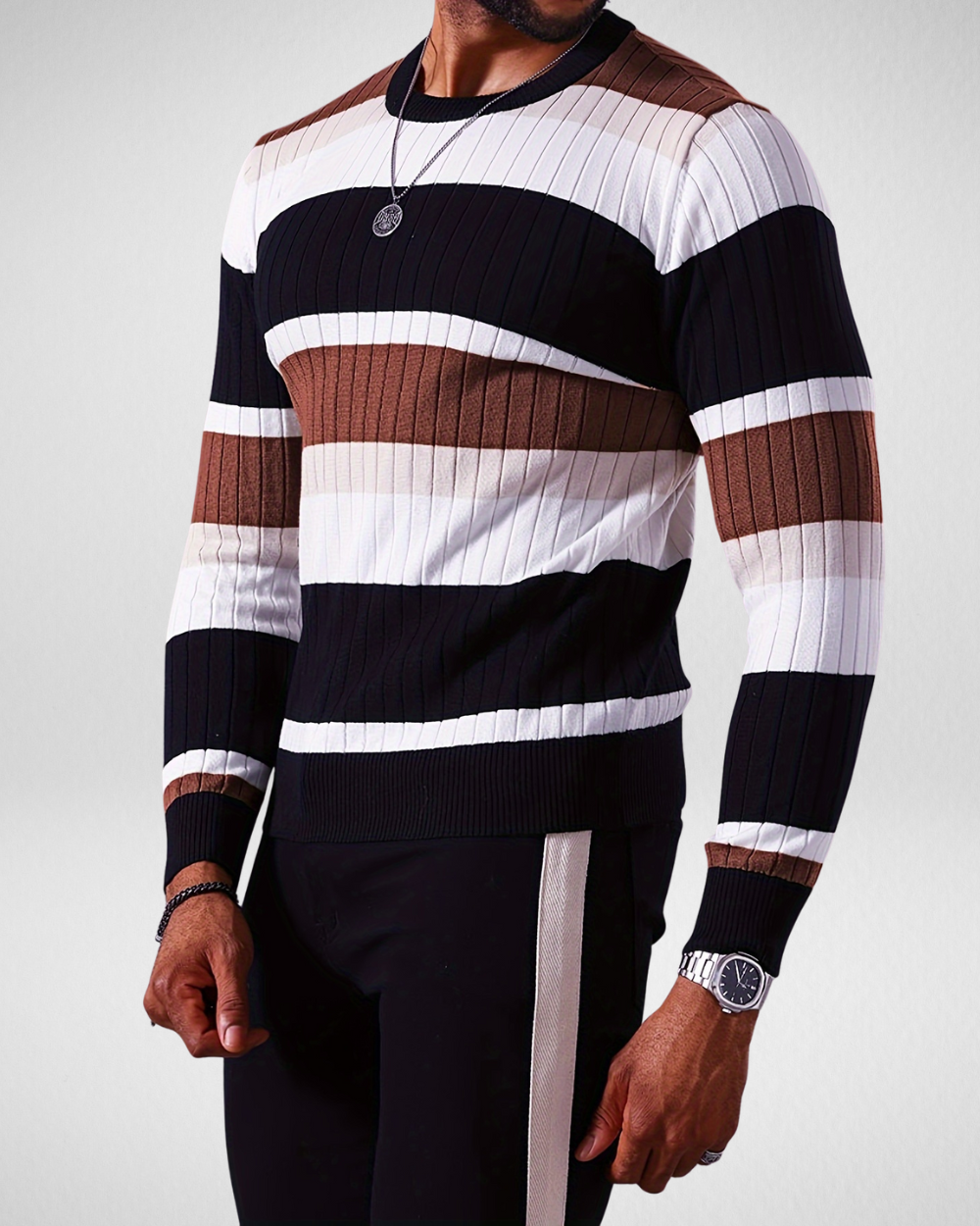 Heren gebreide trui met strepen – Ronde hals – Herfst