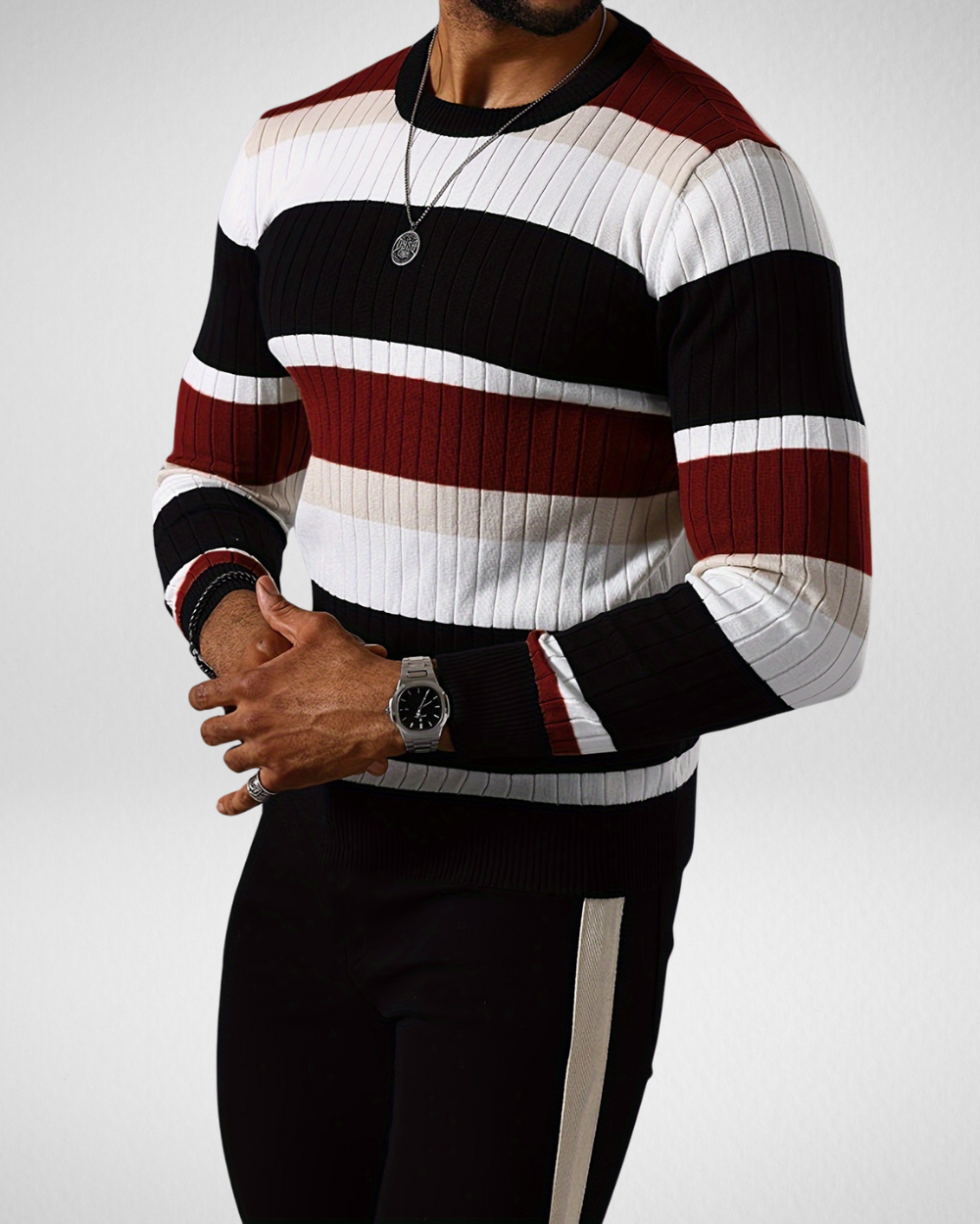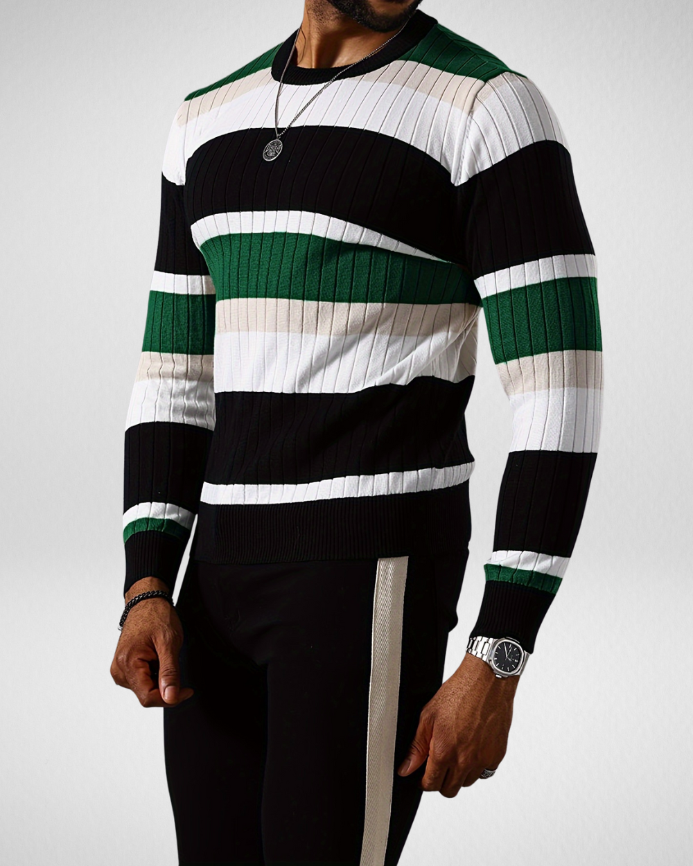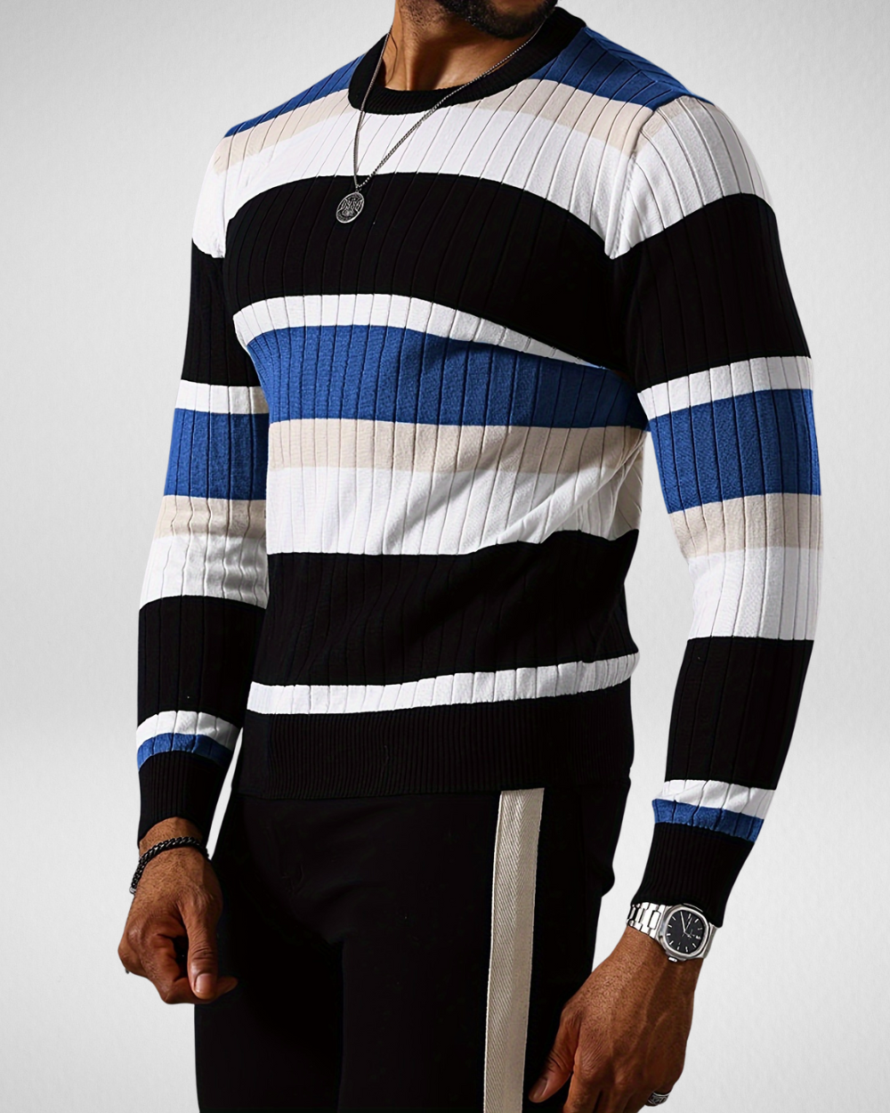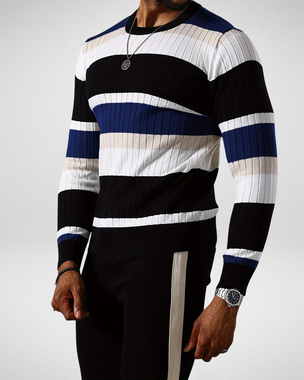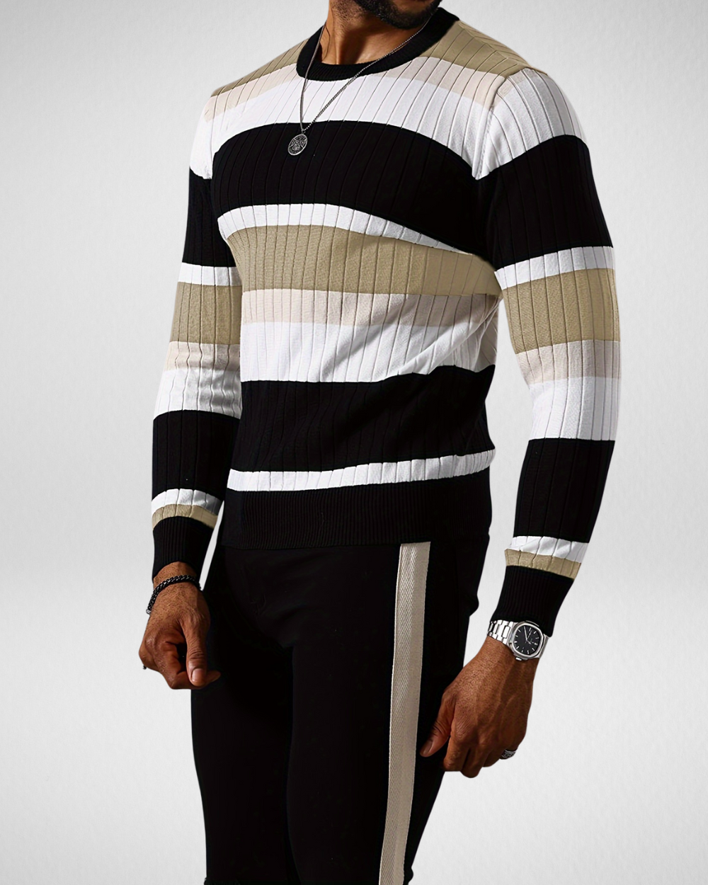 Heren gebreide trui met strepen – Ronde hals – Herfst