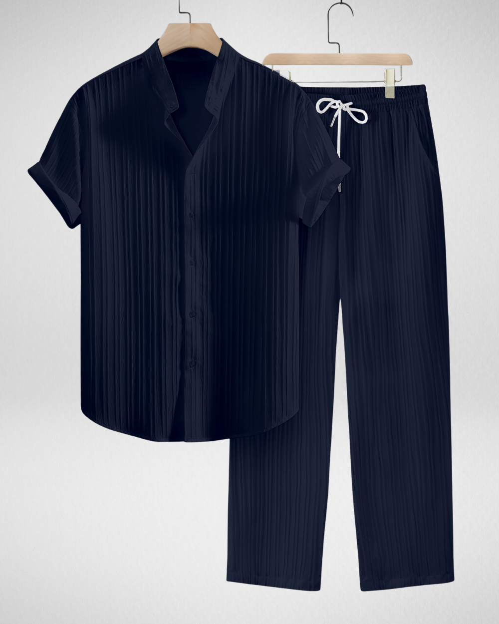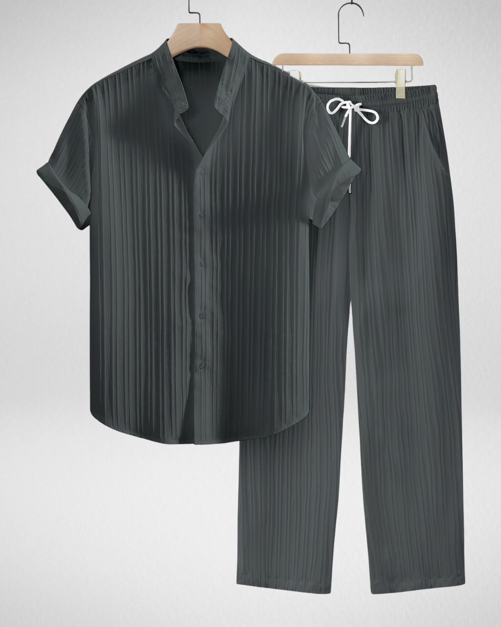 - Functioneel detail: Subtiele verticale structuur en nette kraag geven de set een verzorgde uitstraling.
