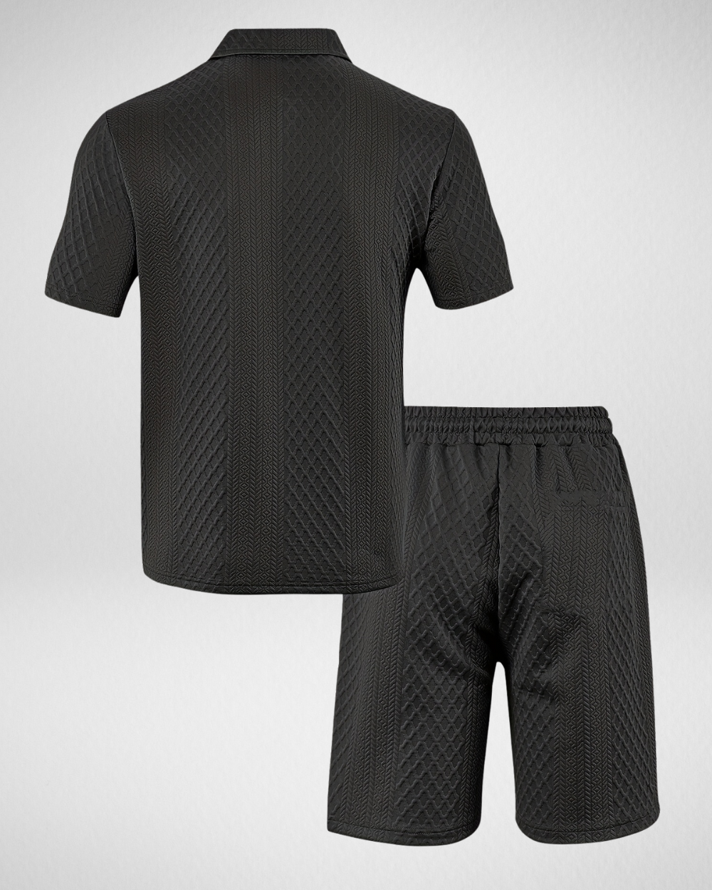 Een elegante en luchtige herenset met geometrische textuur, ontworpen voor comfort en stijl op warme dagen.